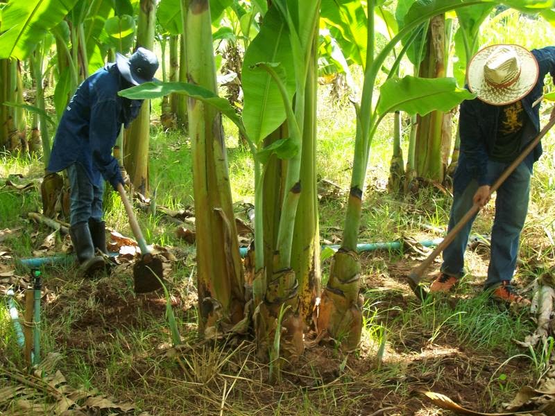 6. เดือนที่ 2 และ 3 ต้นกล้วยจะมีต้นและใบใหม่ทั้งหมด ปัญหาคือหญ้าขึ้นคลุมต้น ต้องถากหญ้าบริเวณโคนต้นออกให้หมด
